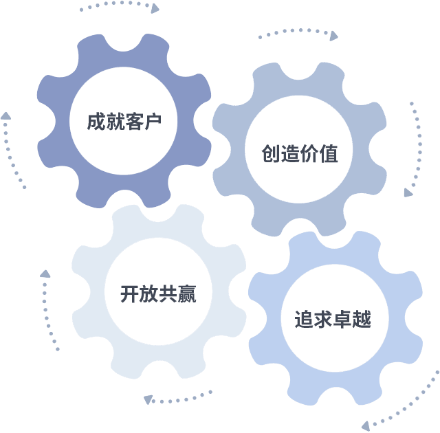 成就客户是一切决策的出发点,,,,创造价值是衡量所有工作的标准,,追求卓越是我们做事做人的态度,,,,开放共赢是我们的格局也是最终的结果。。。。价值观的齿轮环环相扣,,,,推动着组织里的每个人不断向前。。。